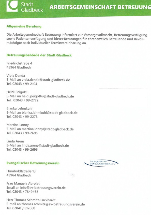 Kostenlose Informationen zum Thema Vorsorgevollmacht und Patientenverfügung sind bei der Betreuungsbehörde der Stadt Gladbeck erhältlich.
